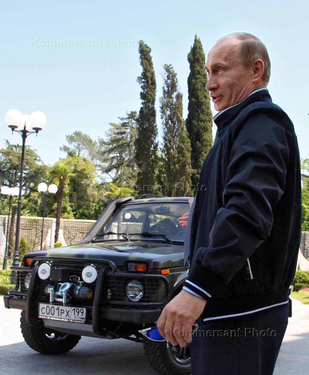Председатель правительства России Владимир Путин у входа в государственную резиденцию "Ривьера-6" в Сочи показал журналистам купленный им внедорожник "Нива".