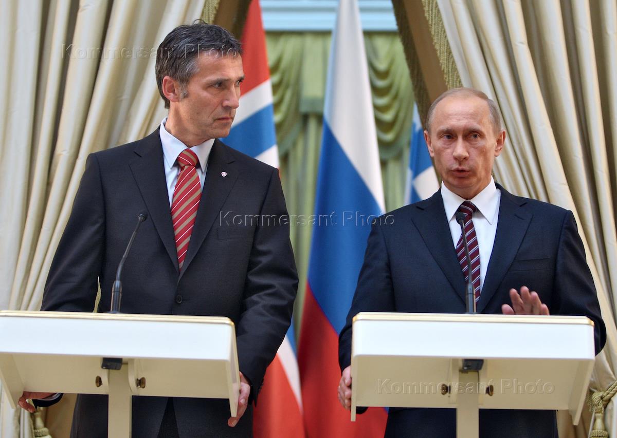 Председатель правительства России Владимир Путин (слева) и премьер-министр Норвегии Йенс Столтенберг (справа) во время официальной встречи в Доме приемов правительства России.