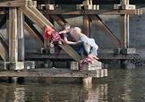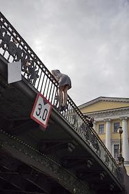Жанровая фотография. Девушка фотографируется на перилах моста через реку .