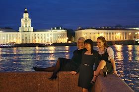 Виды Санкт-Петербурга. Девушки фотографируются на память на набережной Невы.