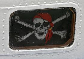 Жанровая фотография. Пиратский флаг на иллюминаторе прогулочного катера.