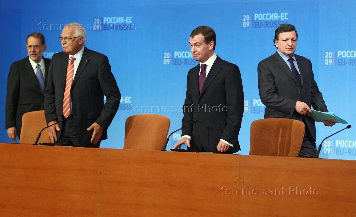 Слева направо: президент Чехии Вацлав Клаус, генеральный секретарь Совета ЕС Хавьер Солана, президент России Дмитрий Медведев и председатель Европейской комиссии Жозе Мануэль Баррозу на саммите Россия – Евросоюз (ЕС).