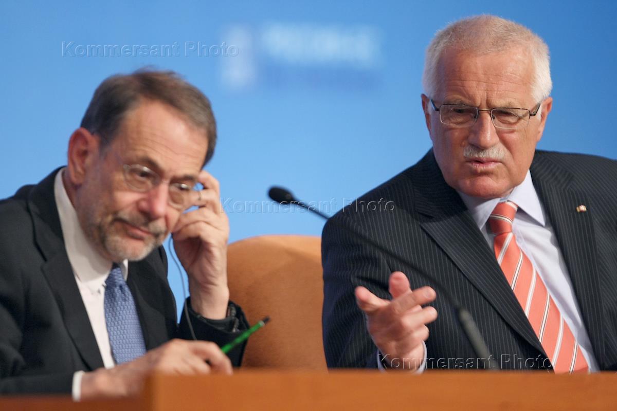 Генеральный секретарь Совета ЕС Хавьер Солана (слева) и президент Чехии Вацлав Клаус (справа) на саммите Россия – Евросоюз (ЕС).