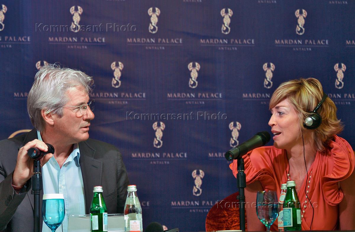 Американские актеры: Ричард Гир (слева) и Шерон Стоун (справа) на пресс-конференции в отеле Mardan Palace.