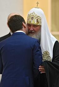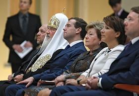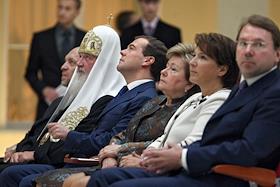 Президент России Дмитрий Медведев (слева) и патриарх Московский и всея Руси Кирилл (справа) перед началом демонстрации фильма о создании Президентской библиотеки имени первого президента России Бориса Ельцина.
