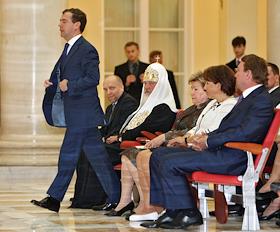 Патриарх Московский и всея Руси Кирилл (слева) и президент России Дмитрий Медведев (справа) перед началом демонстрации фильма о создании Президентской библиотеки имени первого президента России Бориса Ельцина.