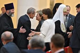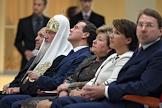 Патриарх Московский и всея Руси Кирилл (в центре) перед началом демонстрации фильма о создании Президентской библиотеки имени первого президента России Бориса Ельцина.
