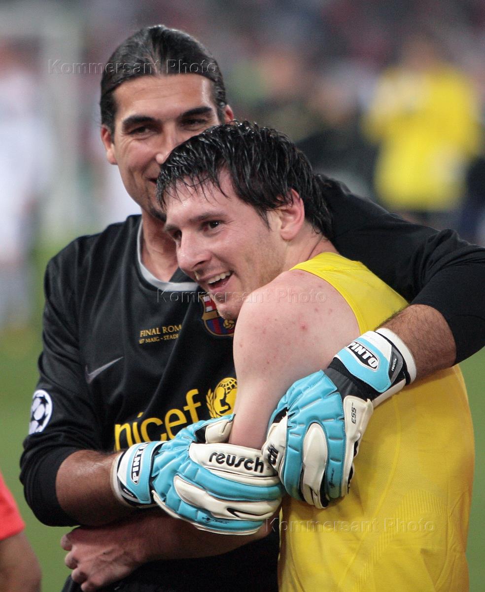 Финал Лиги чемпионов УЕФА между командами "Барселона" (Испания) и "Манчестер Юнайтед" (Англия). Счет встречи 2 : 0 в пользу "Барселоны". Игроки испанской команды Хосе Мануэль Пинто (слева) и Лионель Месси (справа) празднуют победу.