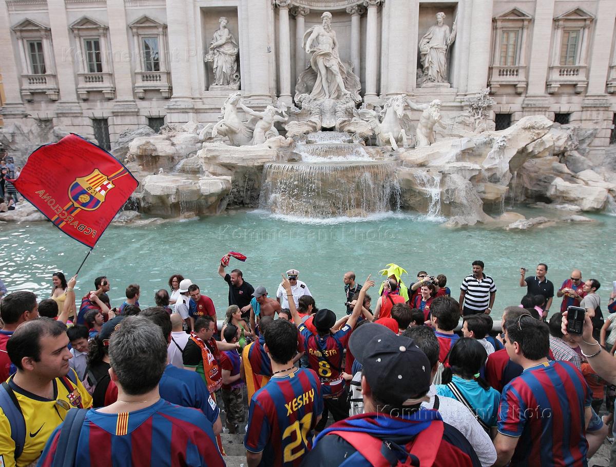 Финал Лиги чемпионов УЕФА между командами "Барселона" (Испания) и "Манчестер Юнайтед" (Англия). Счет встречи 2 : 0 в пользу "Барселоны". Болельщики команды "Барселона" у фонтана де Треви.
