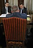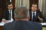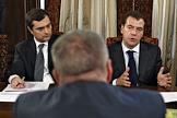 Первый заместитель руководителя руководителя администрации президента России Владислав Сурков (слева) и президент России Дмитрий Медведев (справа) во время встречи с руководством Либерально-демократической партии России. Встреча прошла в государственной резиденции "Барвиха".