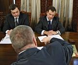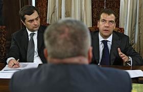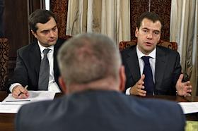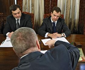 Первый заместитель руководителя администрации президента России Владислав Сурков (слева) и президент России Дмитрий Медведев (справа) во время встречи с руководством Либерально-демократической партии России. Встреча прошла в государственной резиденции "Барвиха".