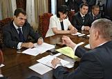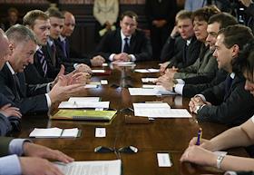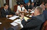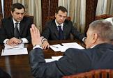 Руководитель фракции ЛДПР в Государственной думе России Игорь Лебедев (второй слева) и лидер Либерально-демократической партии России (ЛДПР), заместитель председателя Государственной думы России Владимир Жириновский (в центре) на встрече президента России Дмитрия Медведева с руководством Либерально-демократической партии России в государственной резиденции "Барвиха".