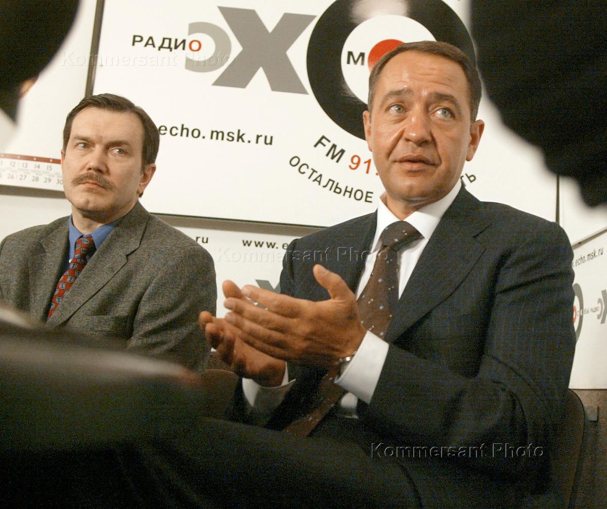 Министр России по делам печати, телерадиовещания и средств массовых коммуникаций Михаил Лесин (справа) и исполнительный директор телекомпании "ТВ — 6 Москва" Павел Корчагин (слева) во время пресс-конференции в эфире радиостанции "Эхо Москвы". Пресс-конференция была посвящена ситуации вокруг Московской независимой вещательной компании (МНВК) "ТВ — 6 Москва".
