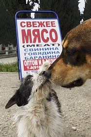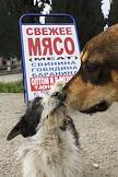Жанровая фотография. Собаки на фоне рекламы свежего мяса.