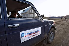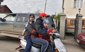 Мужчина везет двоих детей на скутере в поселке Октябрьский.