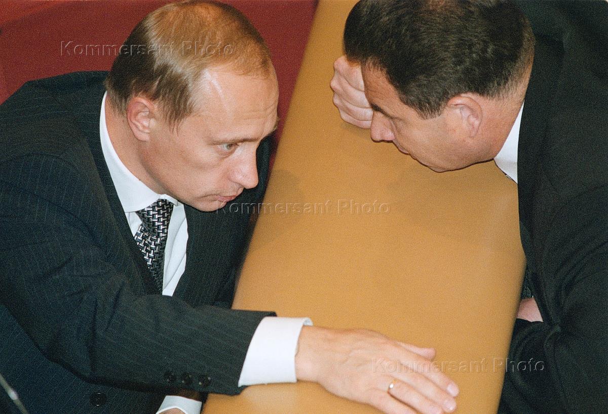 Слева направо: лидер коммунистической партии Российской федерации Геннадий Зюганов, председатель правительства России Владимир Путин и лидер фракции аграриев Николай Харитонов после утверждения кандидатуры премьер-министра в Государственной думе.