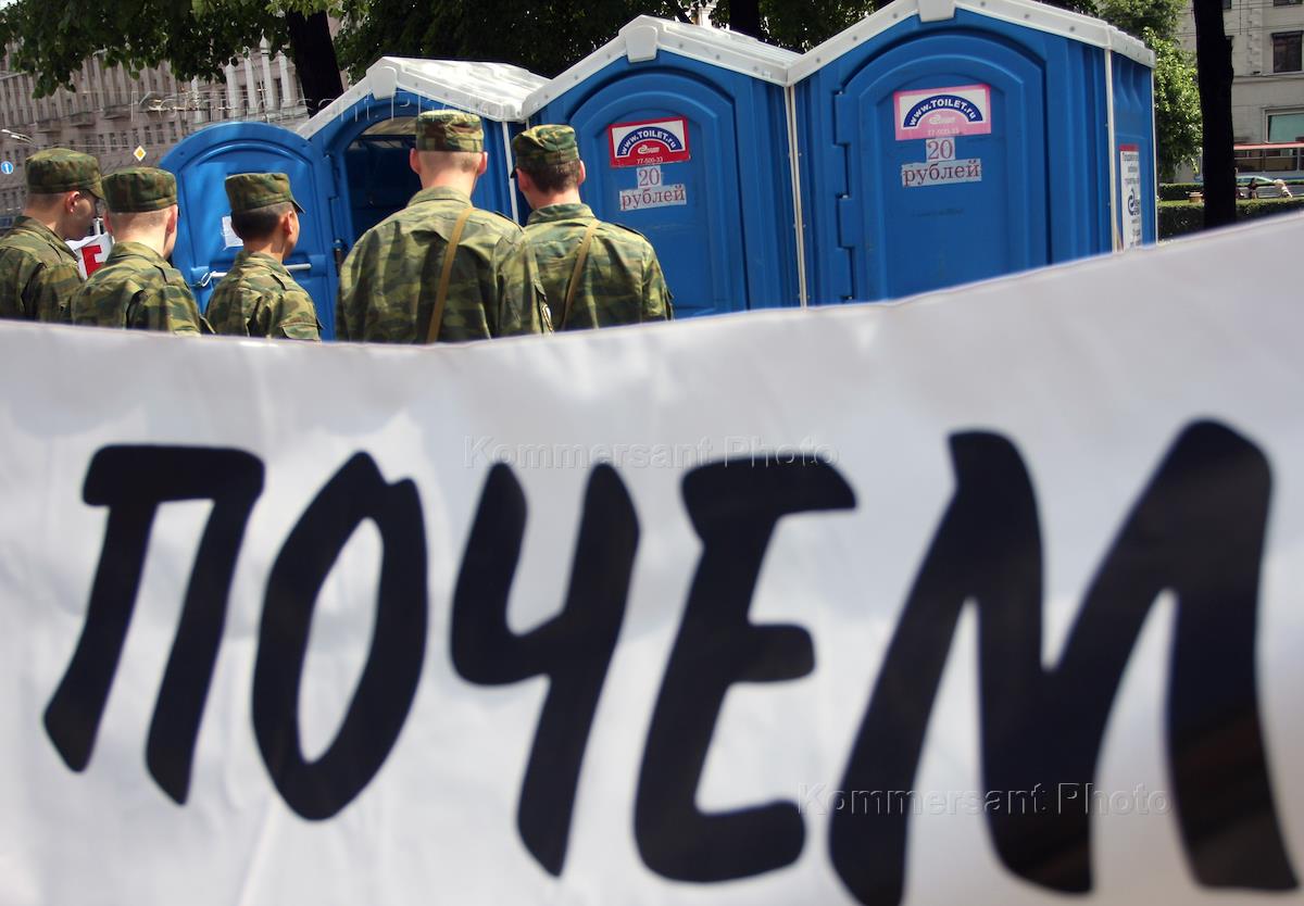Жанровая фотография. Солдаты в очереди в платный уличный туалет. Плакат с надписью "Почем".