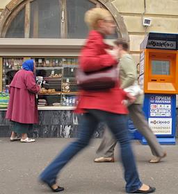 Платежные терминалы в городе. Пожилая женщина у ларька по торговле хлебом.