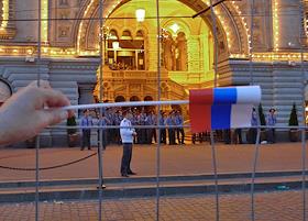 Празднование Дня независимости России на Красной площади. Сотрудники милиции у здания ГУМа в оцеплении.