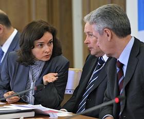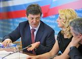 Заместитель председателя правительства России Дмитрий Козак (слева) и министр здравоохранения и социального развития России Татьяна Голикова (в центре) во время заседания правительственной комиссии по вопросам регионального развития. Заседание прошло в здании администрации Алтайского края.