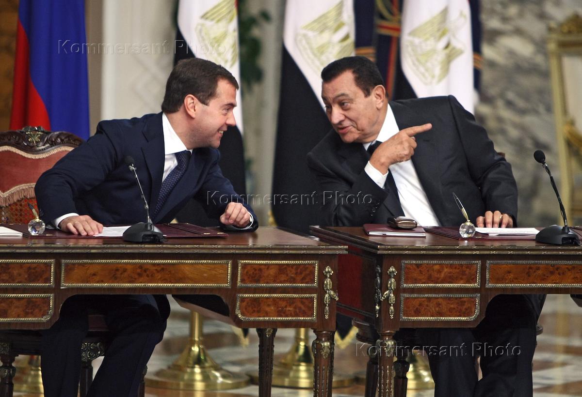 Russian President Dmitriy Medvedev (left) and Egyptian President Hosni Mubarak (right) during the signing of an agreement on strategic cooperation between two countries.
