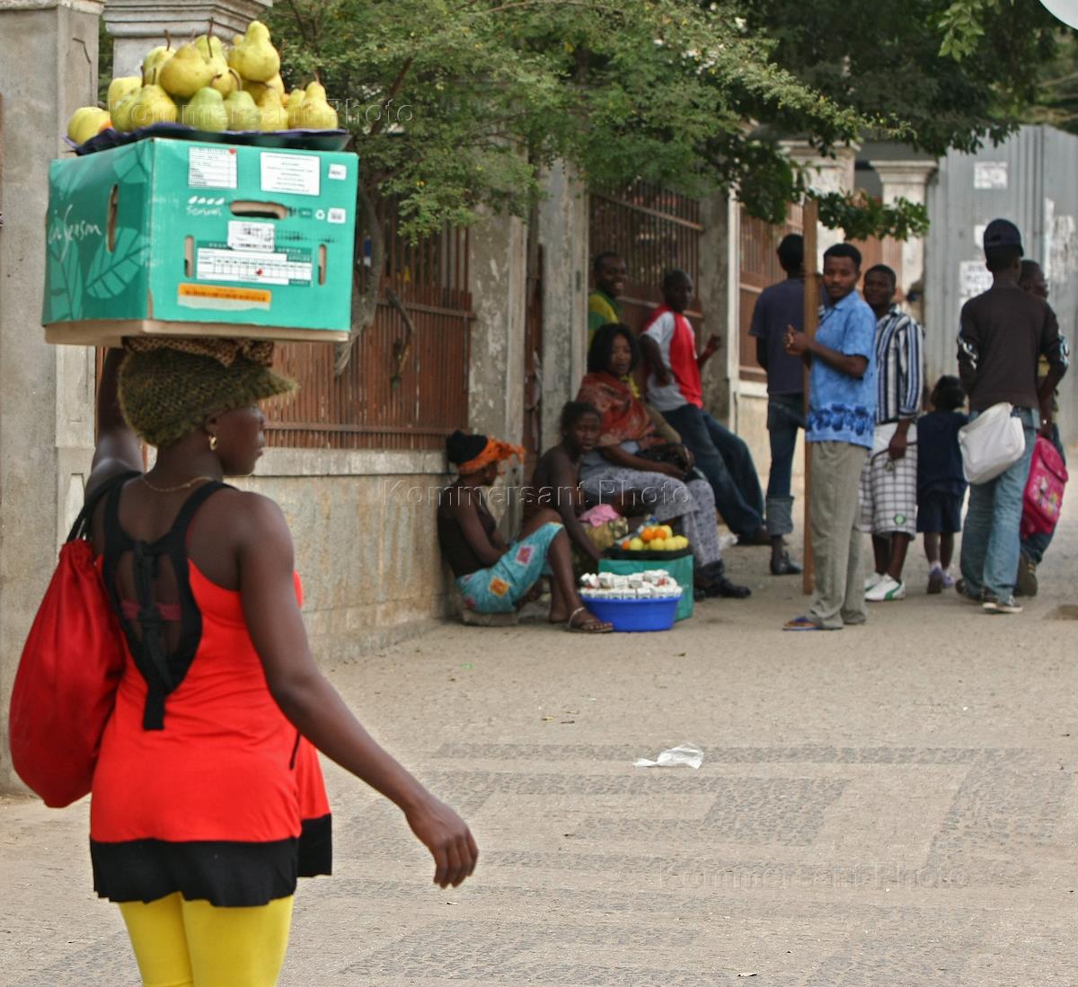 Уличные торговцы с коробками, наполненными фруктами, на голове.