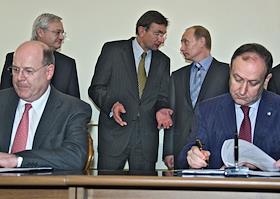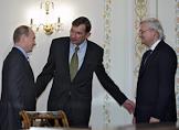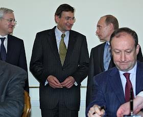 Слева направо: председатель правительства России Владимир Путин, главный исполнительный директор компании Royal Dutch Shell Йерун ван дер Вир и главный финансовый директор компании Royal Dutch Shell Питер Возер во время церемонии подписания документов о сотрудничестве между "Совкомфлот" и Royal Dutch Shell. Церемония прошла в резиденции Ново-Огарево.