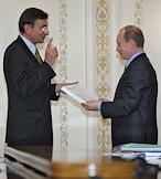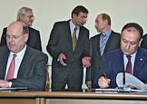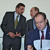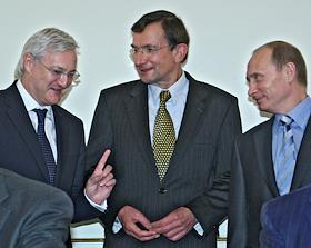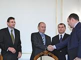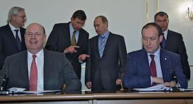 Слева направо: председатель правительства России Владимир Путин, генеральный директор "Совкомфлота" Сергей Франк и заместитель председателя правительства России Игорь Сечин во время церемонии подписания документов о сотрудничестве между "Совкомфлот" и Royal Dutch Shell. Церемония прошла в резиденции Ново-Огарево.