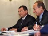 Заместитель председателя правительства России Игорь Сечин (слева) и председатель правительства России Владимир Путин (в центре) во время церемонии подписания документов о сотрудничестве между "Совкомфлот" и Royal Dutch Shell. Церемония прошла в резиденции Ново-Огарево.