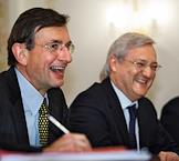 Главный исполнительный директор компании Royal Dutch Shell Йерун ван дер Вир (слева) и главный финансовый директор компании Royal Dutch Shell Питер Возер (справа) на церемонии подписания документов о сотрудничестве между "Совкомфлот" и Royal Dutch Shell. Церемония прошла в резиденции Ново-Огарево.