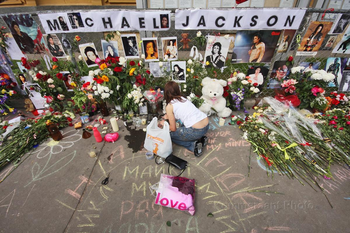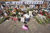 Цветы у ограды посольству США в России, принесенные москвичами в память о американском певце Майкле Джексоне. Майкл Джексон скончался в ночь с 25 на 26 июня от остановки сердца.