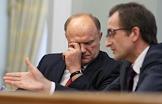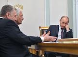 Лидер Коммунистической партии Российской Федерации (КПРФ) Геннадий Зюганов (слева) и руководитель фракции партии "Справедливая Россия" в Государственной думе России Николай Левичев (справа) во время встречи председателя правительства России Владимира Путина с лидерами фракций Государственной Думы России. Встреча прошла в резиденции Ново-Огарево.
