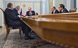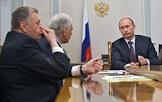 Слева направо: лидер Либерально-демократической партии России (ЛДПР), заместитель председателя Государственной думы России Владимир Жириновский, председатель правительства России Владимир Путин, лидер Коммунистической партии Российской Федерации (КПРФ) Геннадий Зюганов и руководитель фракции партии "Справедливая Россия" в Государственной думе России Николай Левичев во время во время встречи с лидерами фракций Государственной Думы России. Встреча прошла в резиденции Ново-Огарево.