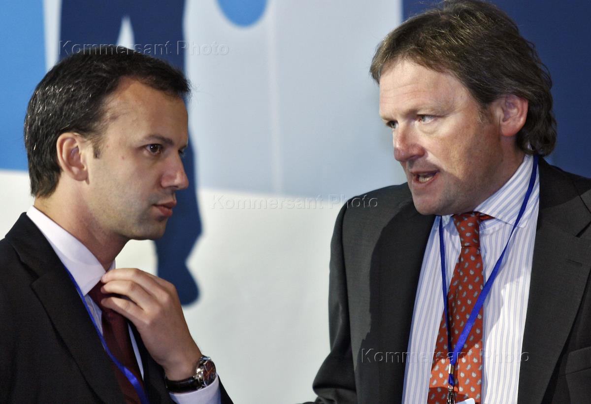Помощник президента России Аркадий Дворкович (слева) и президент ОАО "Российские железные дороги" (РЖД) Владимир Якунин (справа) во время заседания ежегодного бизнес-форума "Кризис: от выживания к обновлению". Заседание прошло в Центре международной торговли (ЦМТ).