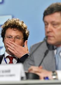 Президент - председатель правления ЗАО "Внешторгбанка Розничные услуги" Михаил Задорнов (слева) и президент Альфа-банка Петр Авен (справа) во время заседания ежегодного бизнес-форума "Кризис: от выживания к обновлению". Заседание прошло в Центре международной торговли (ЦМТ).