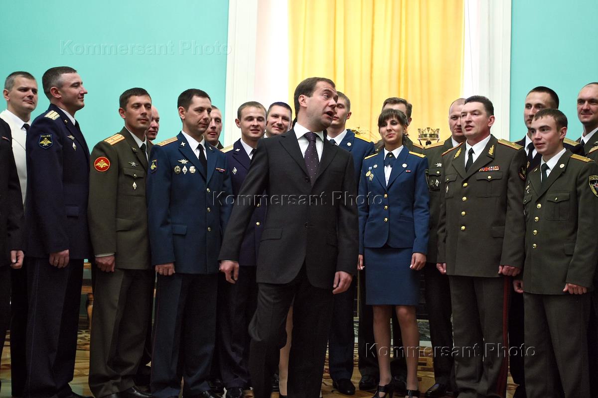 Президент России Дмитрий Медведев (в центре) во время торжественного приема в честь выпускников военных академий, университетов и институтов. Прием прошел в Кремле.
