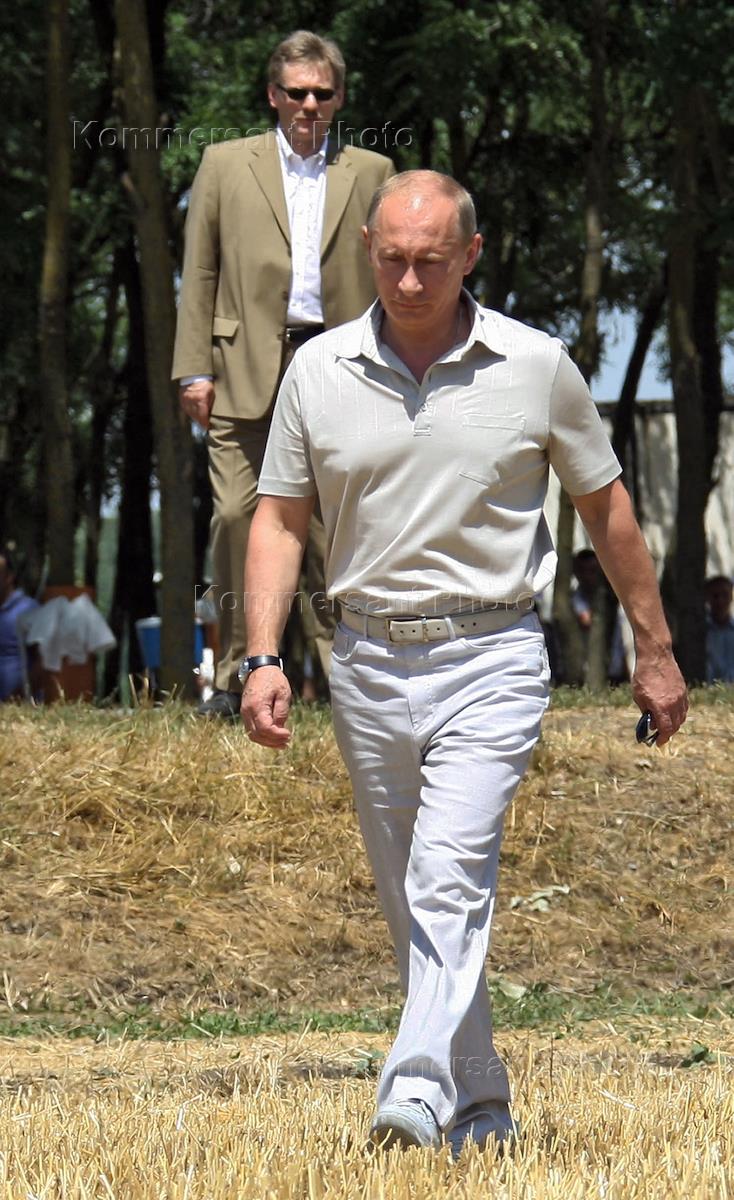 Пресс-секретарь правительства России Дмитрий Песков (слева) и председатель правительства России Владимир Путин (справа) в ходе рабочей поездки в Краснодарский край ознакомились с ходом уборки урожая на пшеничном поле ЗАО фирмы "Агрокомплекс" в станице Выселки.