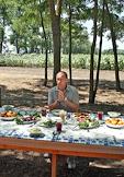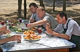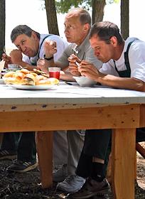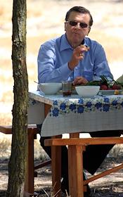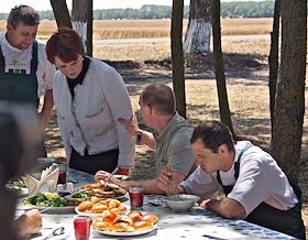 Заместитель председателя правительства России Виктор Зубков за столом полевой кухни. В ходе рабочей поездки в Краснодарский край он ознакомился с ходом уборки урожая на пшеничном поле ЗАО фирмы "Агрокомплекс" в станице Выселки.