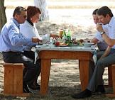 Министр сельского хозяйства России Елена Скрынник (вторая слева) и председатель правительства России Владимир Путин (второй справа) за столом полевой кухни. В ходе своей рабочей поездки в Краснодарский край они ознакомились с ходом уборки урожая на пшеничном поле ЗАО фирмы "Агрокомплекс" в станице Выселки.