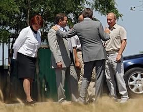 Заместитель председателя правительства России Виктор Зубков (слева), министр сельского хозяйства России Елена Скрынник (вторая слева) и председатель правительства России Владимир Путин (справа) в ходе рабочей поездки в Краснодарский край ознакомились с ходом уборки урожая на пшеничном поле ЗАО фирмы "Агрокомплекс" в станице Выселки.