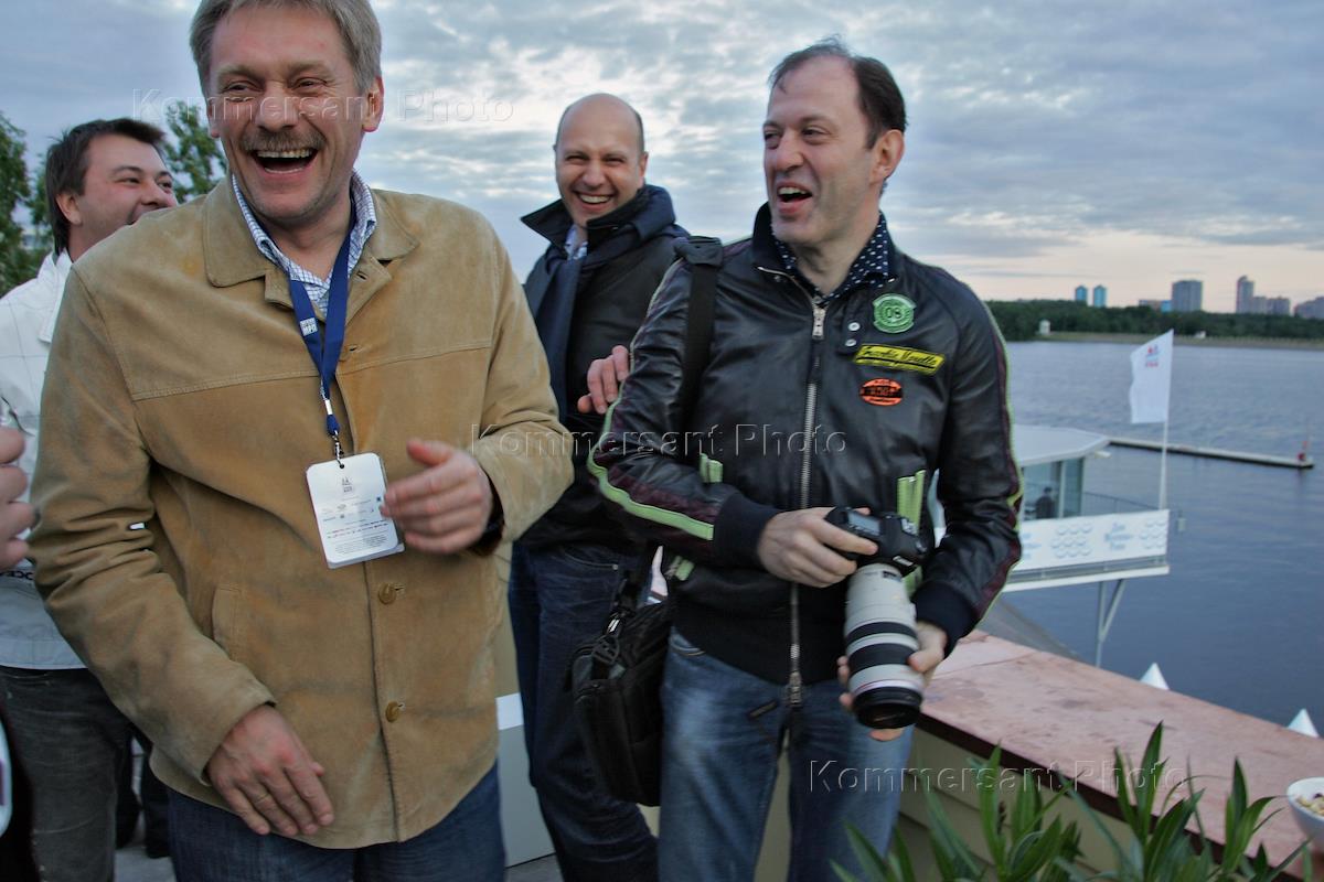 Префект Северного административного округа (САО) Москвы Олег Митволь (слева) и пресс-секретарь правительства России Дмитрий Песков (справа) на "Белом концерте" группы "Мумий тролль". Концерт прошел в рамках V Московского фестиваля яхт в Royal Yacht Club.