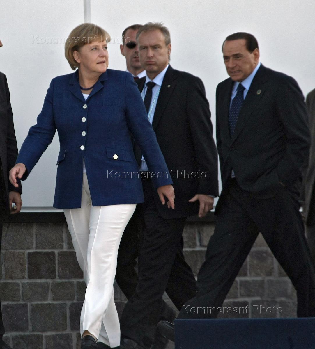 Саммит стран "Большой Восьмерки" (G8) в Аквиле. Канцлер Германии Ангела Меркель (слева) и премьер-министр Италии Сильвио Берлускони (справа) перед началом заседания в формате "восьмерка" плюс "пятерка".
