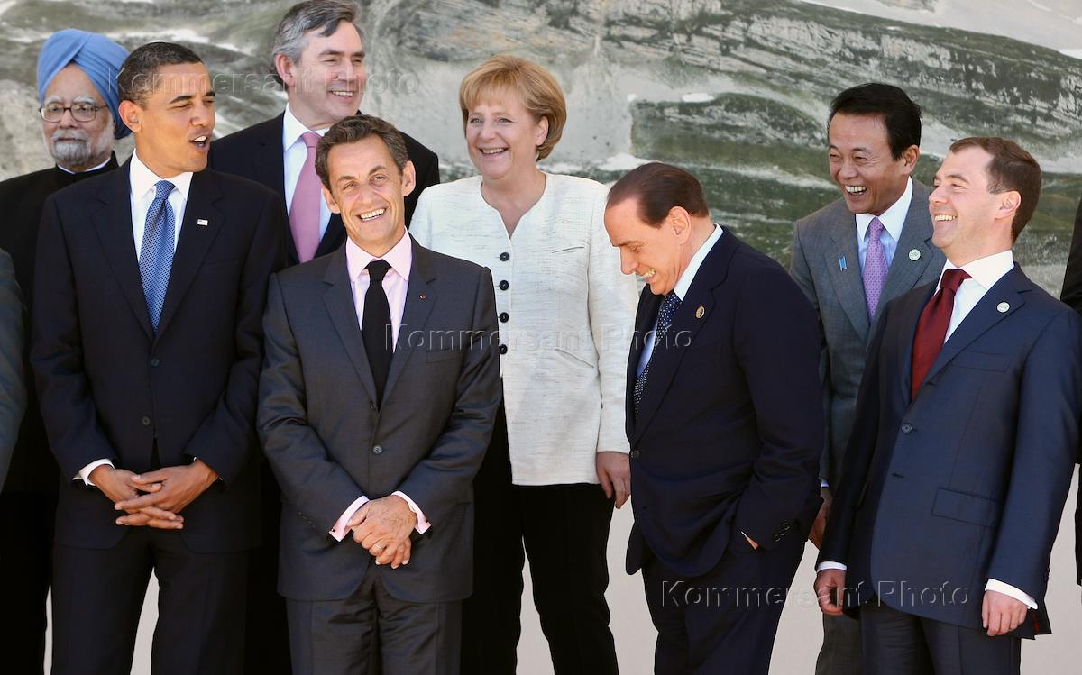 Саммит стран "Большой Восьмерки" (G8) в Аквиле. Слева направо: премьер-министр Индии Манмохан Сингх, президент США Барак Обама, премьер-министр Великобритании Гордон Браун, президент Франции Николя Саркози, Федеральный канцлер Германии Ангела Меркель, председатель Совета министров Италии Сильвио Берлускони, премьер-министр Японии Таро Асо и президент России Дмитрий Медведев на церемонии официального фотографирования участников саммита в формате "восьмерка" плюс "пятерка".
