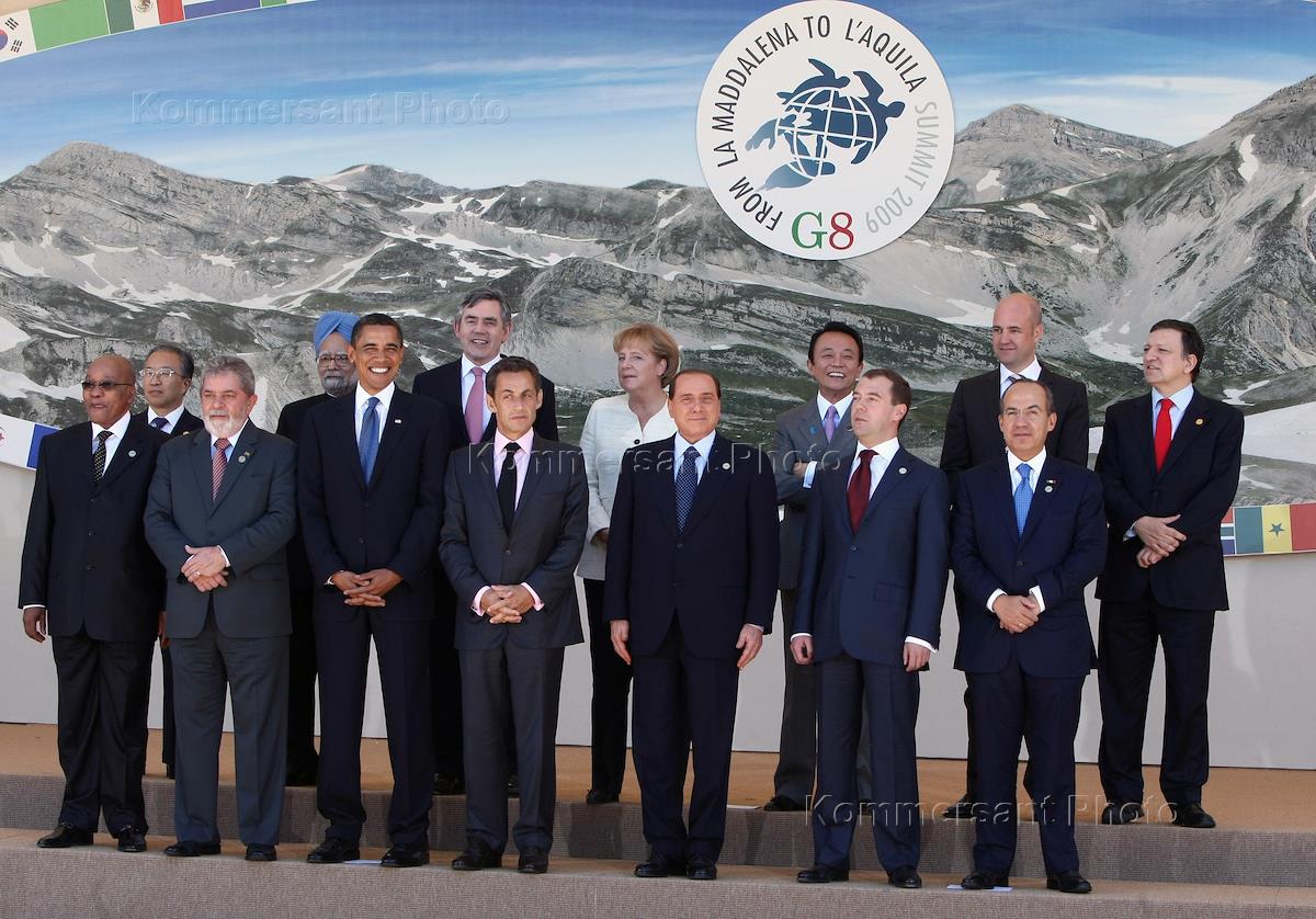 Саммит стран "Большой Восьмерки" (G8) в Аквиле. Слева направо: премьер-министр Индии Манмохан Сингх, президент США Барак Обама, премьер-министр Великобритании Гордон Браун, президент Франции Николя Саркози, Федеральный канцлер Германии Ангела Меркель, председатель Совета министров Италии Сильвио Берлускони, премьер-министр Японии Таро Асо и президент России Дмитрий Медведев на церемонии официального фотографирования участников саммита в формате "восьмерка" плюс "пятерка".