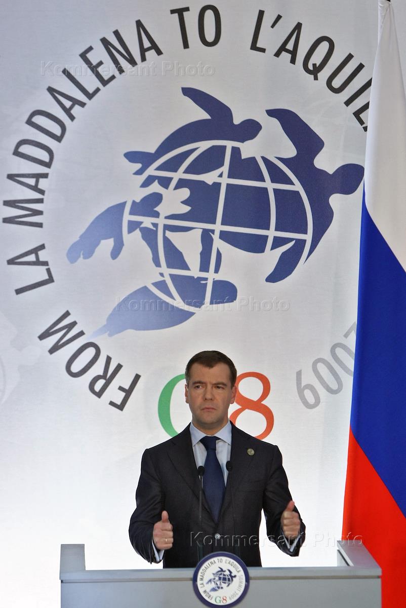 Президент России Дмитрий Медведев во время саммита стран "Большой Восьмерки" (G8) в Аквиле.