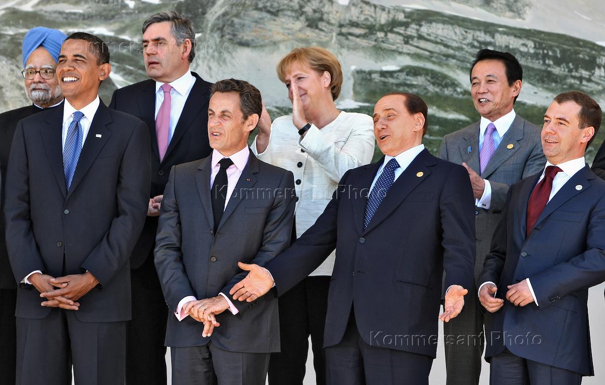 Саммит стран "Большой Восьмерки" (G8) в Аквиле. Слева направо: премьер-министр Индии Манмохан Сингх, президент США Барак Обама, премьер-министр Великобритании Гордон Браун, президент Франции Николя Саркози, Федеральный канцлер Германии Ангела Меркель, председатель Совета министров Италии Сильвио Берлускони, премьер-министр Японии Таро Асо и президент России Дмитрий Медведев на церемонии официального фотографирования участников саммита в формате "восьмерка" плюс "пятерка".