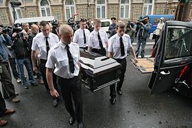 Слева направо: писатели Дмитрий Быков, Михаил Мишин и президент "Фонда защиты гласности" Алексей Симонов на церемонии прощания с писателем Василием Аксеновым. Церемония прошла в Центральном доме литераторов.