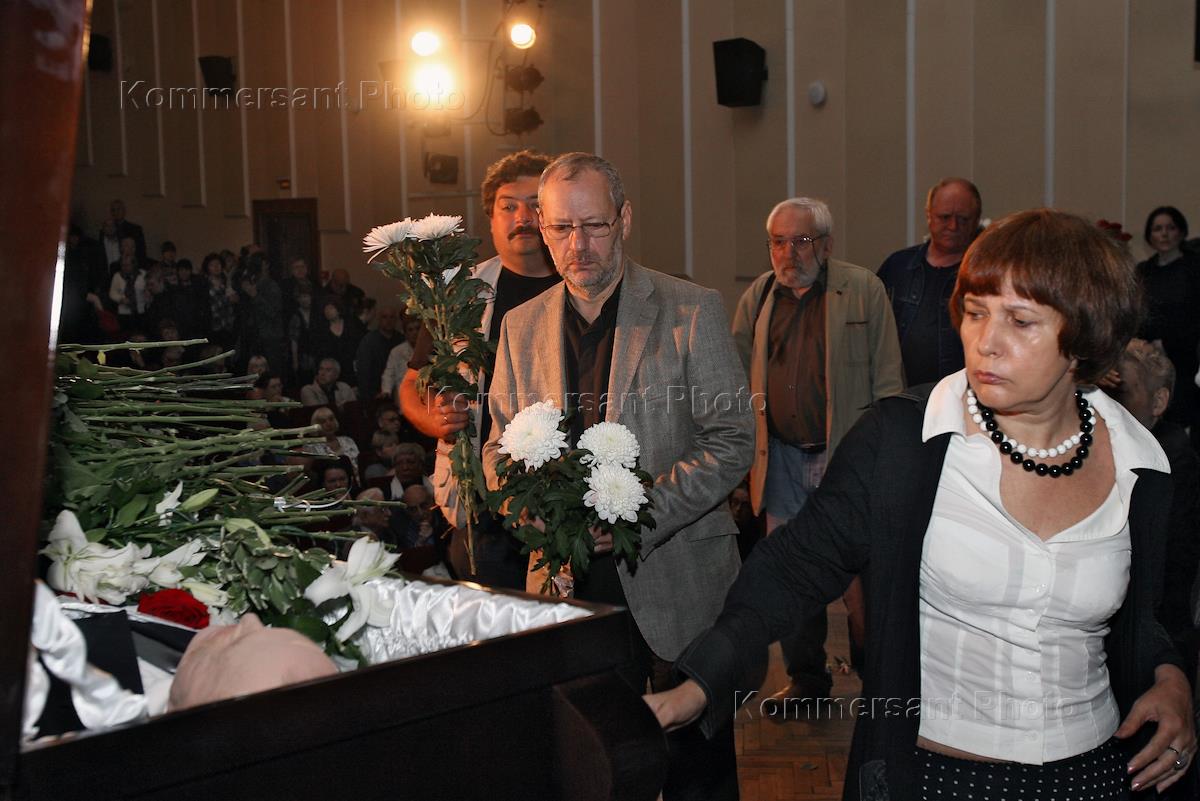 Слева направо: поэтесса Белла Ахмадулина, художник Борис Мессерер, директор Государственного музея изобразительных искусств (ГМИИ) имени А.С.Пушкина Ирина Антонова и режиссеры Марлен Хуциев на церемонии прощания с писателем Василием Аксеновым. Церемония прошла в Центральном доме литераторов.