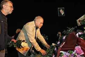 Художник Игорь Обросов (слева) и режиссеры Марлен Хуциев (второй слева) и Марк Розовский (справа) на церемонии прощания с писателем Василием Аксеновым. Церемония прошла в Центральном доме литераторов.