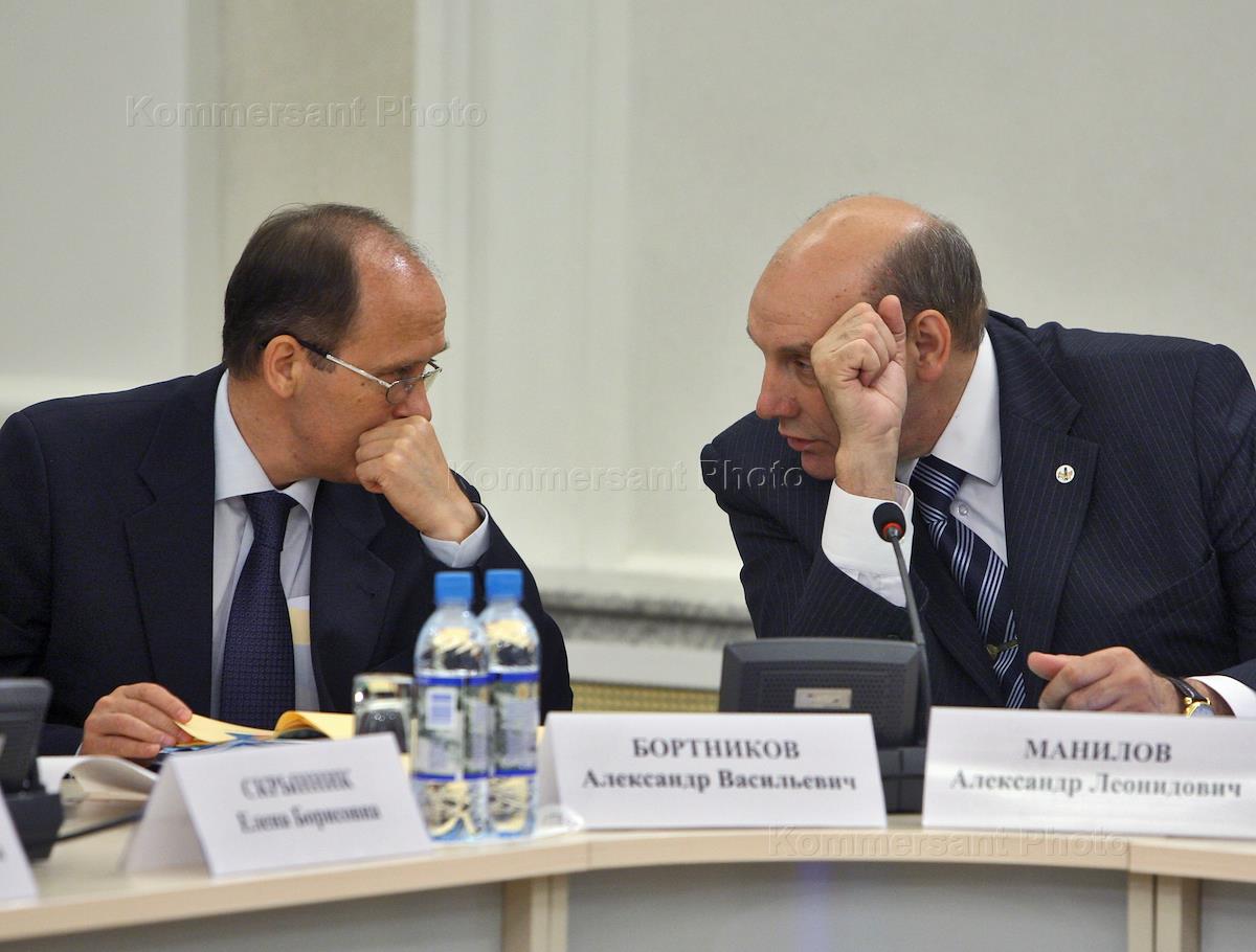 Russian federal service of security director Aleksandr Bortnikov (left) and chairman of the coordinating service of the Council of the commanders of the frontier troops Aleksandr Manilov (right) at the meeting of the State frontier commission.
